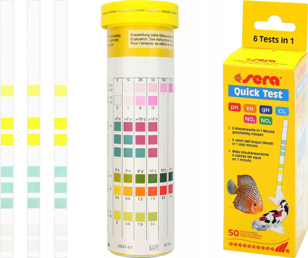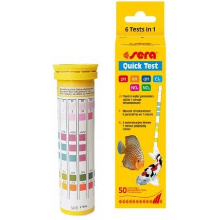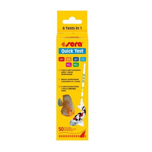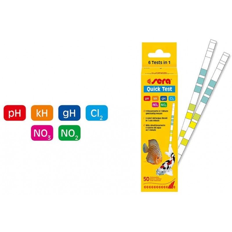 The sera Quick Test provides the optimal possibility to check the most important water parameters (pH value, carbonate hardness, total hardness, nitrate, nitrite and chlorine) in the aquarium with just one test strip quickly and without any problems.