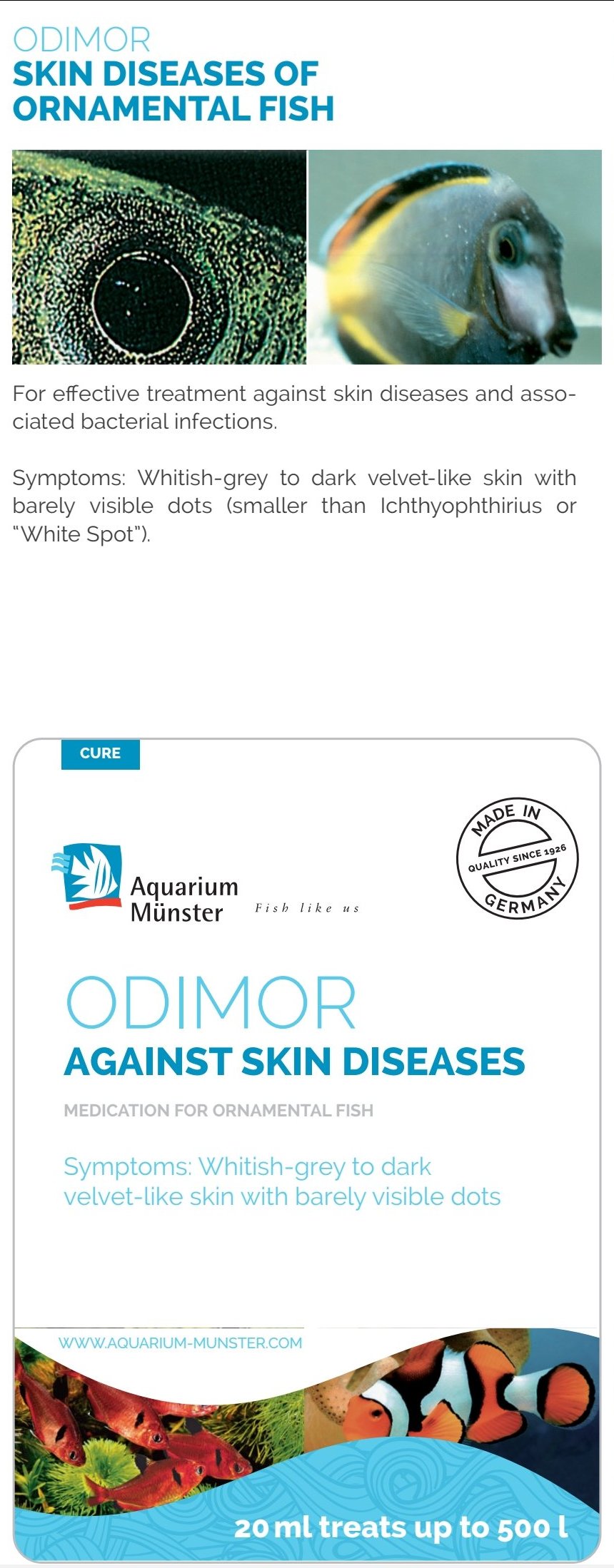 ODIMOR is a specialized ornamental fish treatment for velvet diseases (Oodinium, Chilodonella, Ichthybodo, Trichodina, etc.). Visible symptoms include pale grey to dark, velvet-like films or barely visible spots which, during subsequent stages, spread to the gills, fins and the entire body. The gills remain open and the fish exhibits increased respiratory activity which can reach levels of acute respiratory distress.