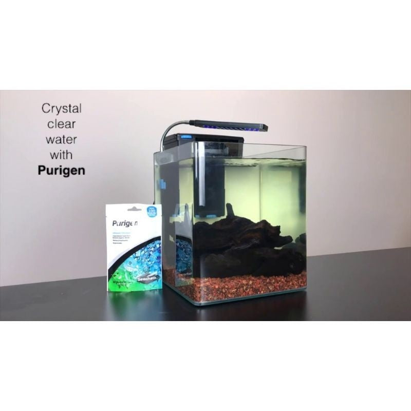 Purigen is a premium synthetic adsorbent that is unlike any other filtration product. It is not a mixture of ion exchangers or adsorbents, but a unique macro-porous synthetic polymer that removes soluble and insoluble impurities from water at a rate and capacity that exceeds all others by over 500%. Purigen controls ammonia, nitrites and nitrates by removing nitrogenous organic waste that would otherwise release these harmful compounds. Purigen’s impact on trace elements is minimal. It significantly raises redox. It polishes water to unparalleled clarity. Purigen darkens progressively as it exhausts, and is easily renewed by treating with bleach. Purigen is designed for both marine and freshwater use.